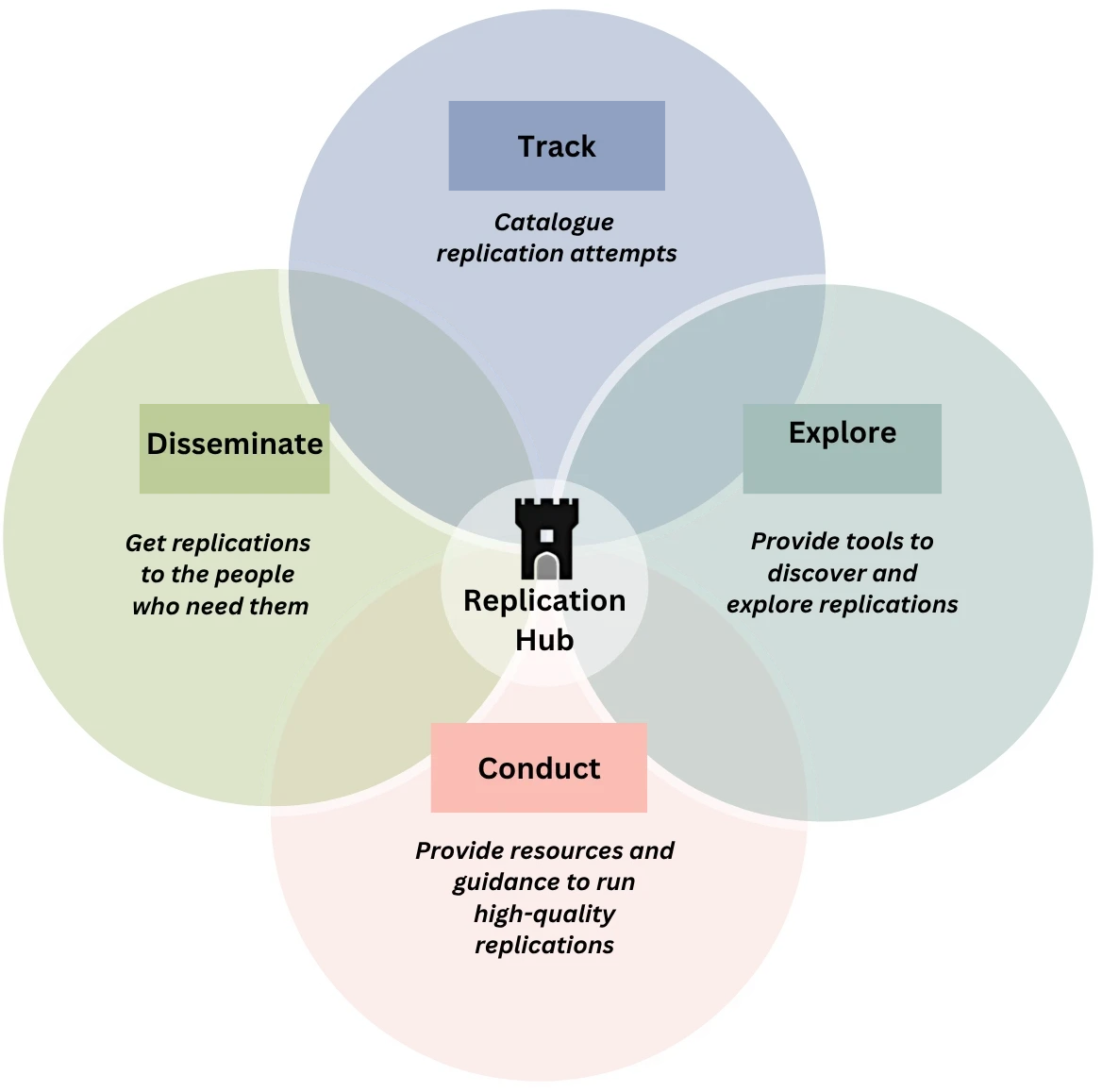 With the FORRT Replication Hub, our mission is to support reproduction and replication studies across all stages of the research process as well as all research disciplines. It consists of a comprehensive collection of resources and tools designed to assist researchers in the tracking, finding & exploring, conducting, and publishing & dissemination of reproduction and replication studies.